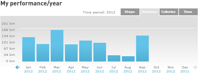 There are in fact still two days to go to the end of September, but already it’s clear from the graph that with a result of 139 km for September so far I’ve beaten the January result of 135 km and won’t manage to beat the March record (the record month for this year – and of all time – although that only means since May 2011 when I got the pedometer) of 170 km. I prefer to save attempting that one for October – we’ll see how that goes. There were three better months in 2011 or between 150 and 165 km, so that makes this month the 5th best.